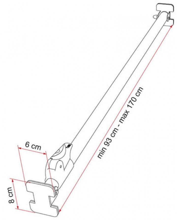 Laget i robust og lett eloksert aluminium. Enkel å korte ned til minimum 20 cm og å forlenge til 170 cm for å kunne tilpasses til arealets størrelse. Mål sammenslått: 93 x 8 x 6 cm.