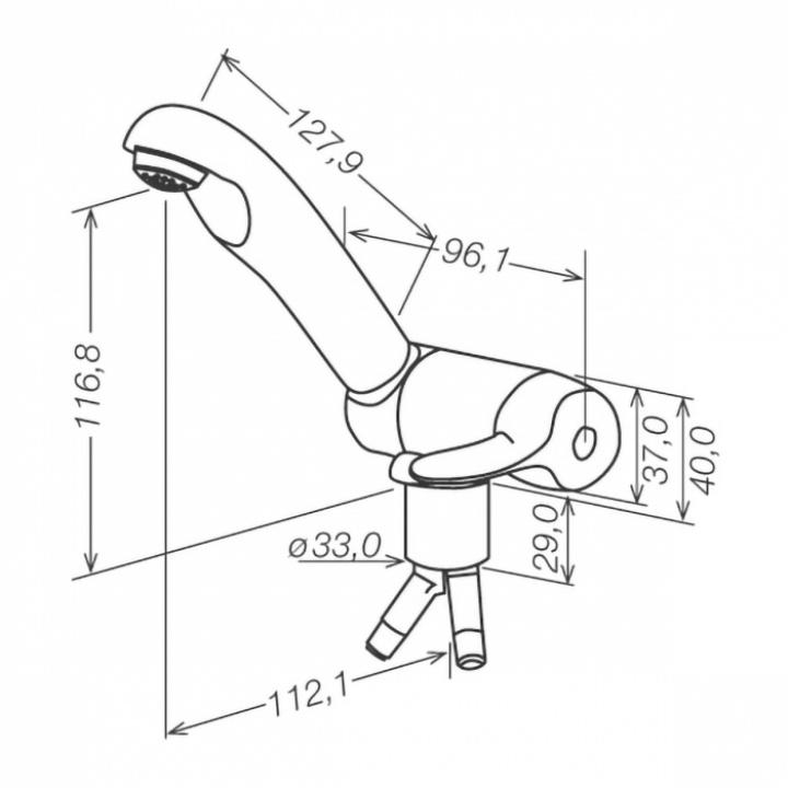 Nedfellbar kran. For 33 mm hull. Med strømbryter. Høyde 40 mm. Max trykk 6 bar. - Dokument